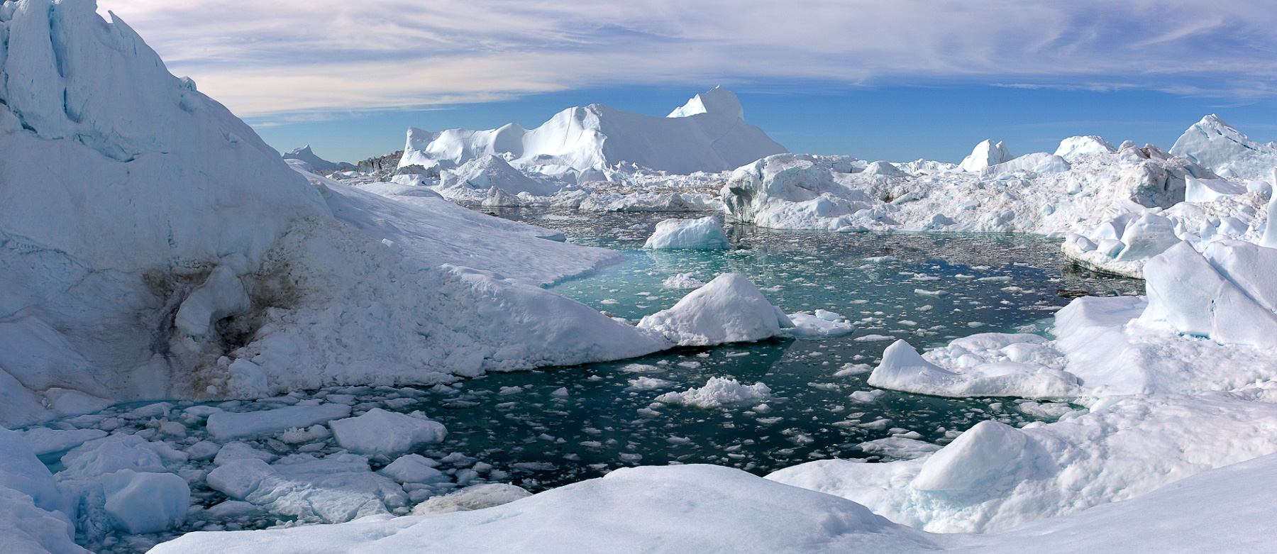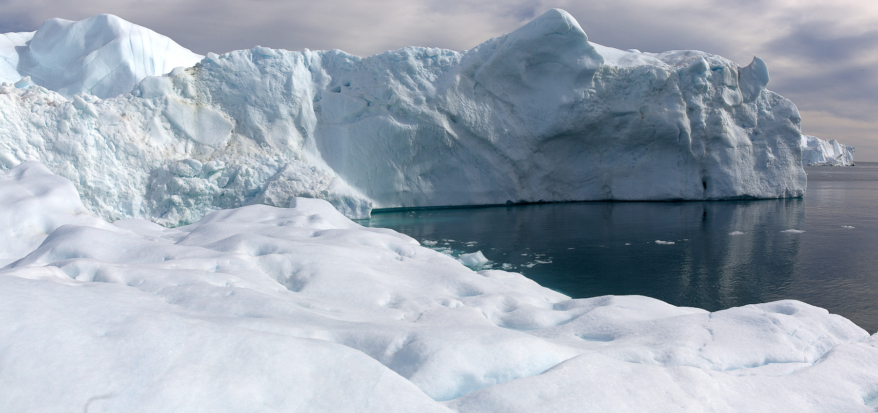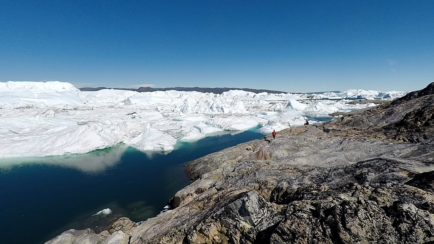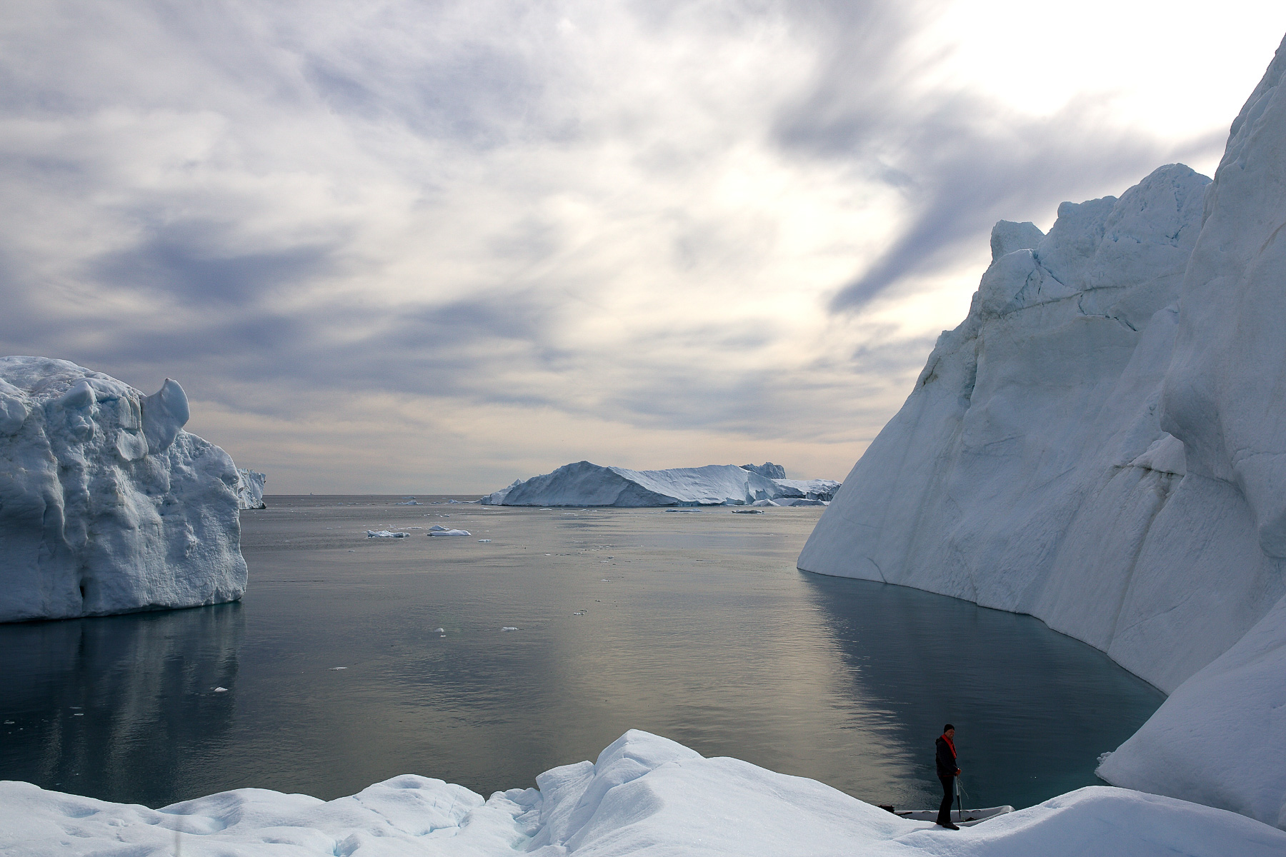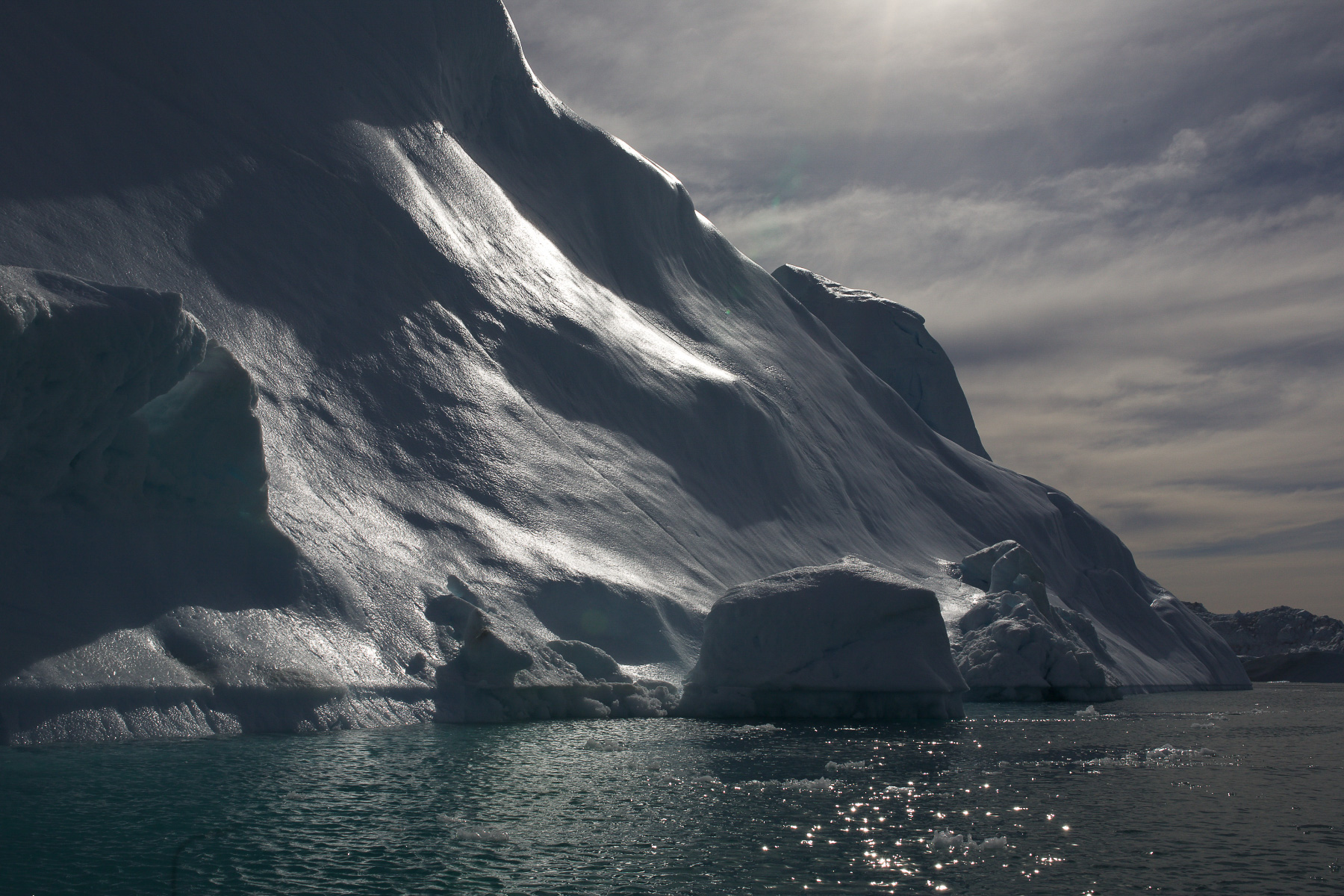Dann eines der sensationellsten Naturschauspiele diese Erde. Eine kleine Wanderung führt uns auf einen Punkt, von dem aus wir den grönländischen Eispanzer und seine Zunge zum Wasser sehen können. Vor sich schiebt er ein Trümmerfeld an Eisbergen jeder Größe vor sich her. Das Besondere ist die Barre am Ende des Fjords; der Meeresgrund ist hier nur noch zwischen 100m und 200m tief. Die kleinen Krümel mit geringerer Tiefe können passieren, die großen Stauen sich. Es ist wie auf der Autobahn, wenn die PKW Spur noch funktioniert, die LKW aber nicht mehr weiterkönnen. Durch den Druck von hinten türmen sich die Giganten auf quetschen und Drücken, bis sie soweit brechen, dass sie über die Barre ins offene Meer können. Supercool!