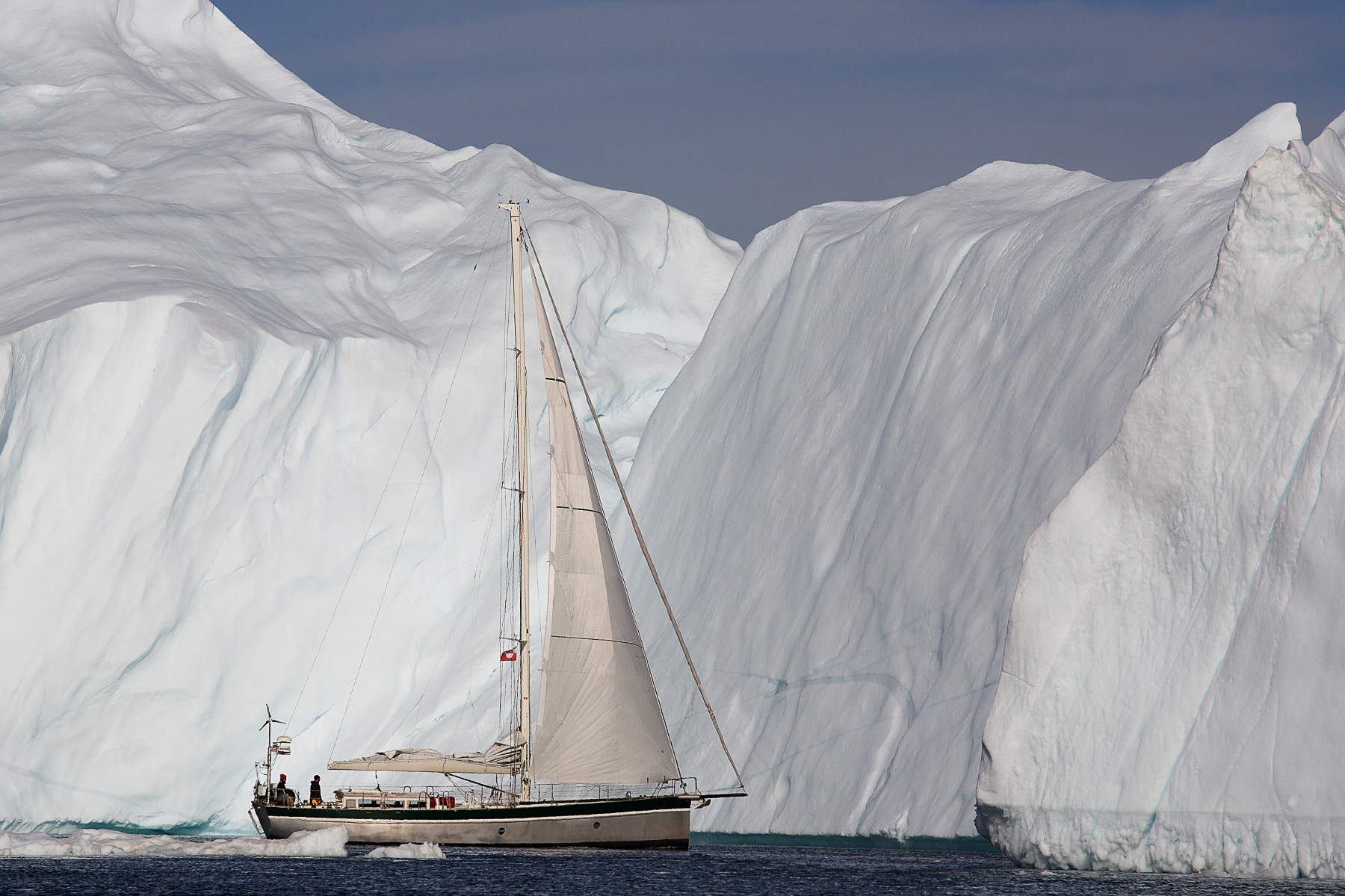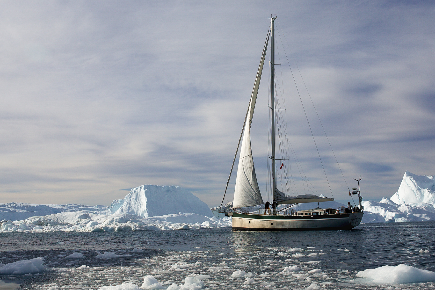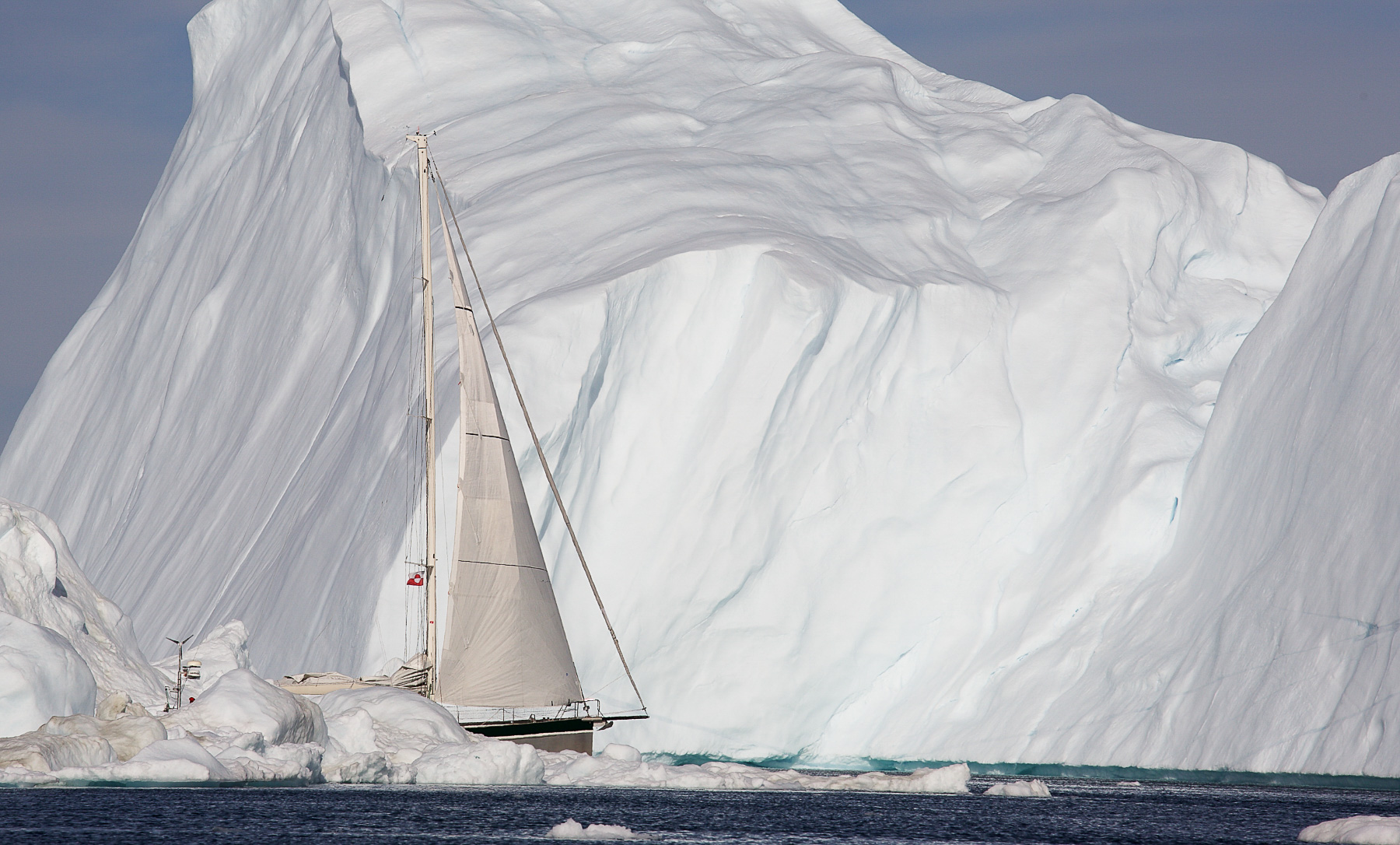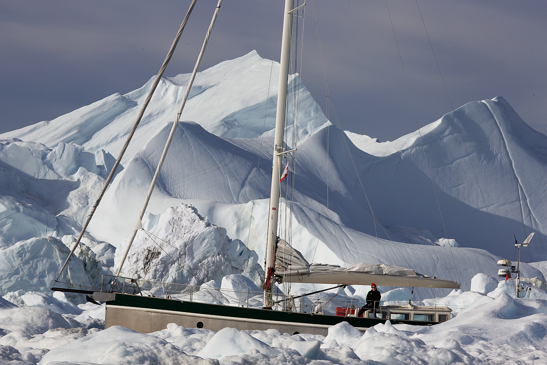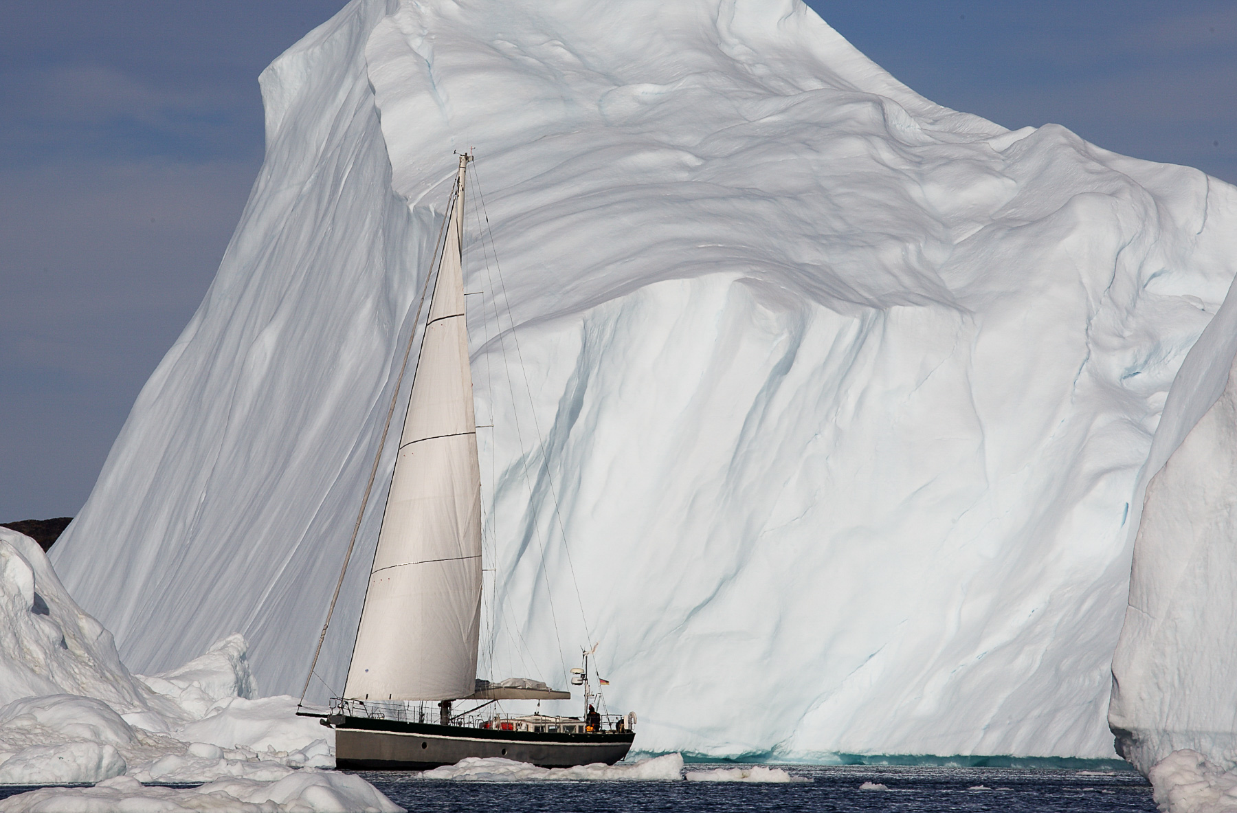 Wir haben stabile östliche Winde. Für unseren Kurs der nächsten Zeit (im wesentlichen Nord vor der grönländischen Westküste) ideal. Genügend aber nicht zu viel Wind, keine Welle. So verholen wir am Morgen schnell ganz nah an den Südrand des Ilulisaat Eisfjords. (69°07,8 N 051°05,2 W). Vorsichtige Annäherung über nicht kartographiertes Gebiet und Anker lassen an einem wunderschönem, völlig geschütztem Ankerplatz neben den Eisgiganten.